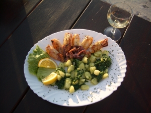 Niewielkie kalmary, kilka sztuk, sprawiamy w ten sposób – odcinamy część z mackami, wtedy z pozostałej „tuby” możemy bez problemu wyjąć tzw. ość, przypominającą przeźroczysty plastik. Na patelni grillowej lub na grillu płytowym posmarowanym oliwą, mocno rozgrzanym, układamy sprawione części kalmara. Smażymy raptem kilka minut, tak aby się lekko zrumieniły – dłuższe smażenie powoduje, że kalmary stają się gumowate. Tuż przed zdjęciem ich z grilla polewamy oliwą z rozgniecionym czosnkiem i rozrobioną z odrobiną białego wina. Kalmary kładziemy na talerzu wraz z tym sosem. Podajemy z gotowanymi ziemniakami i np. ze szpinakiem, oczywiście nie rozdrobionym, lecz w liściach.